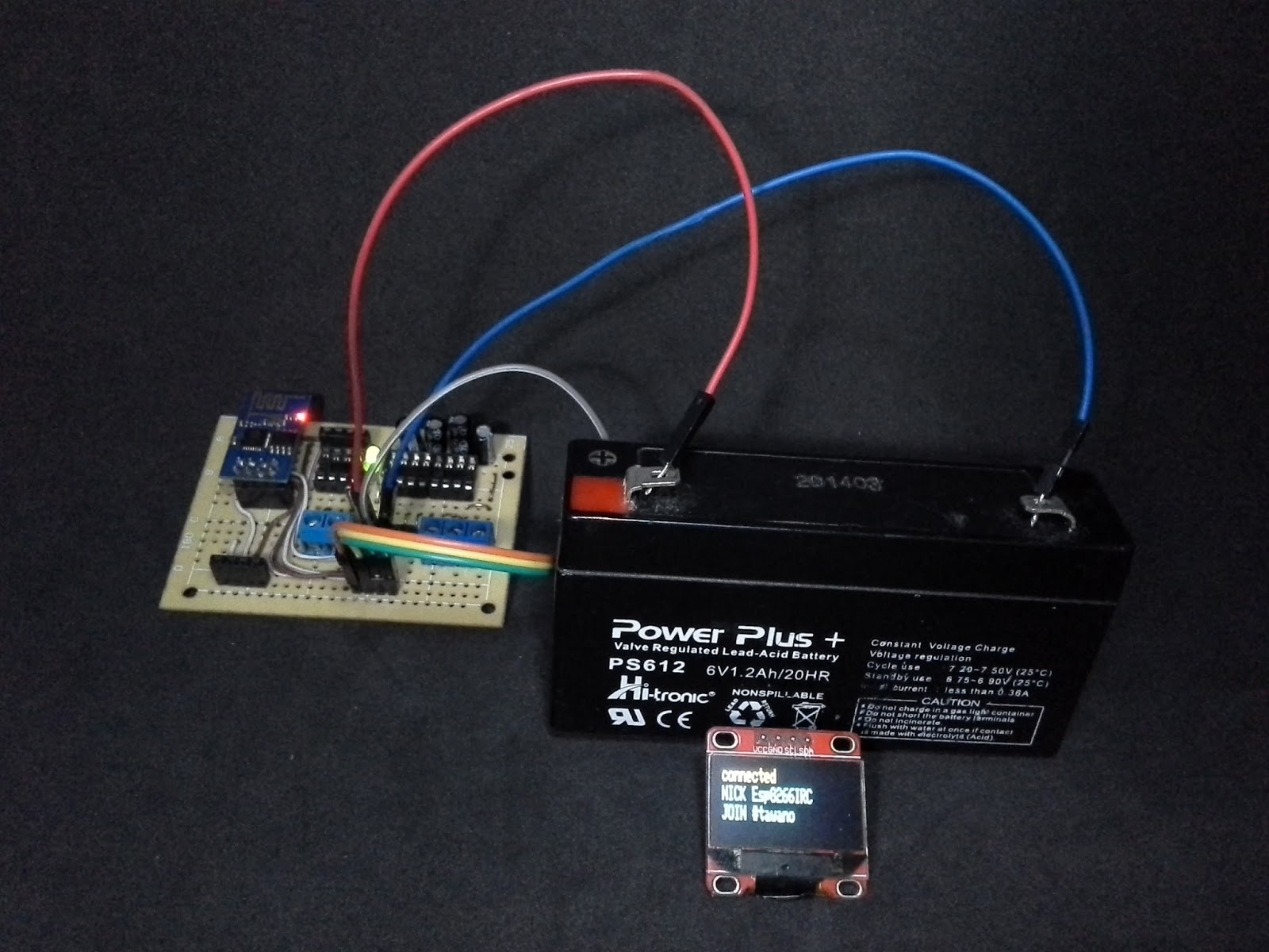 En este caso se ha utilizado para alimentar el sistema una bateria de 6v, para este caso tener en cuenta que el modulo ESP8266 se debe aliemntar a 3.3v se debe utilizar un regulador de voltaje.