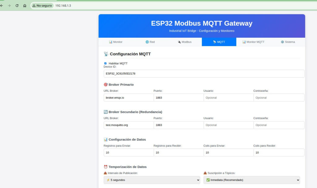 En las pruebas que realice, implemente un servidor web, el cual funciona al conectar el esp32 a una red wifi, cuenta con configuracion de direcciones IP Fijas o asignacion por DHCP, Cliente MQTT que permite la configuracion de 2 broker, uno principal y uno de respaldo o redundancia en caso de falla del primero.